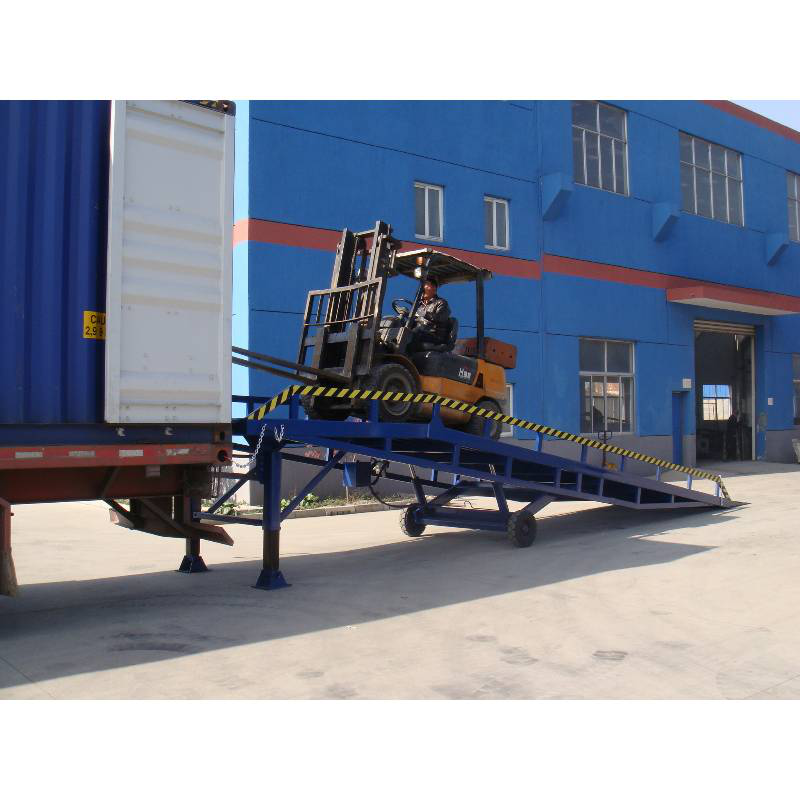 移動式登車橋是固定式登車橋的姊妹產品,它主要應用在車站、碼頭、工廠倉庫等貨運量大,但又不方便做貨臺的場所,能夠在地面和運輸車輛之間搭起一座橋,使叉車使得地行駛,達到裝卸貨目的,該設備一端與地面接觸,另一端搭接在車廂后緣上,并能根據不同車型及裝車過程中車廂的變化,自動調整高度,從而大大提高工作效率。主體部分采用矩形管焊接而成,強度高,承載能力大;液壓系統采用進口手壓泵,安全耐用;橋面采用高強度鋼板網,增加了磨擦系數,便于叉車的行駛,減輕了橋體的自身重量,使移動更加靈活。
